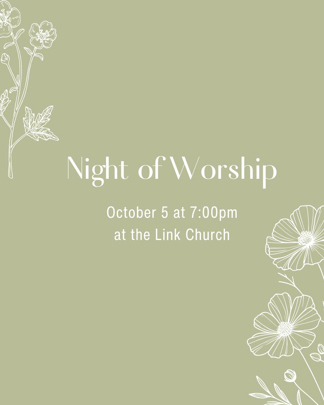 We are having a Night of Worship on October 5 starting at 7pm. There will be no agenda for this evening. All are welcome to join us for a night that will be led by the spirit.